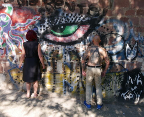 In this section in the park homeless and socially vulnerable people, many with drug addiction hang out. Drawn to the amazing graffiti on the wall, SU-EN started an improvisation session.